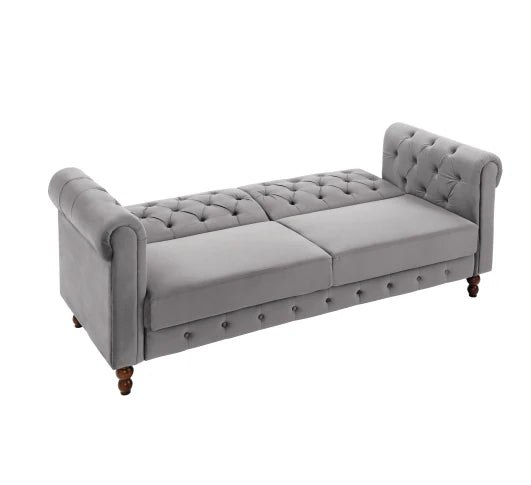 Introducing the Chesterfield Sofa Bed, a stunning centrepiece that combines timeless elegance with modern functionality. This grey upholstered masterpiece features a classic tufted backrest and armrests, adorned with button detailing on the front panel for a sophisticated touch. The sturdy wooden legs provide stability and a natural finish that complements any decor. Perfect for cozy evenings or accommodating overnight guests, this versatile Chesterfield Sofa Bed seamlessly transforms your living space into a haven of style and comfort.